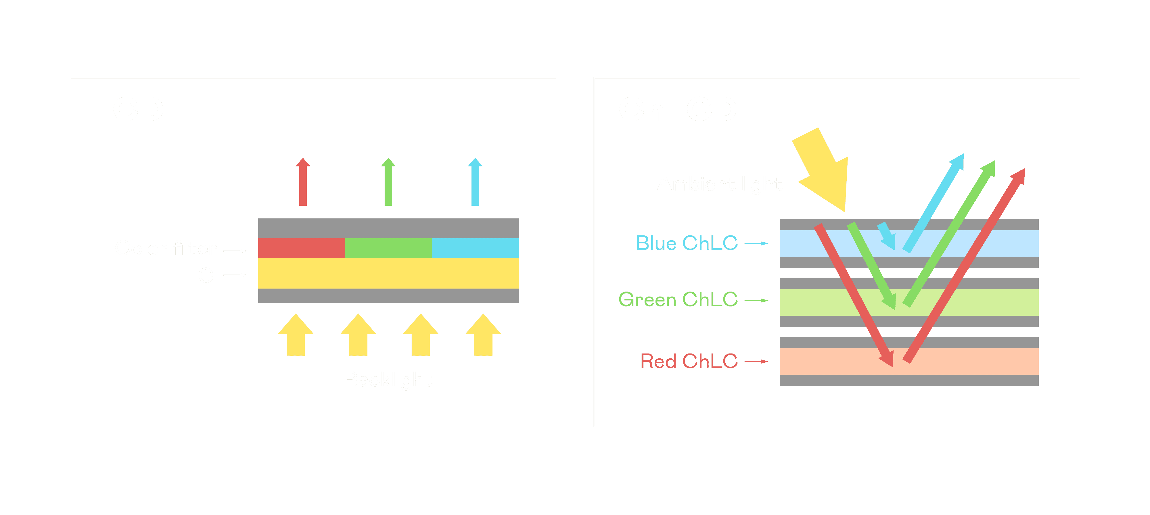 财神娱乐胆固醇液晶显示器是由红、、、绿、、、、蓝三层胆固醇液晶面板堆叠而成,,,并采用无彩色滤光片设计,,,减少环境光在反射过程中的损耗。。