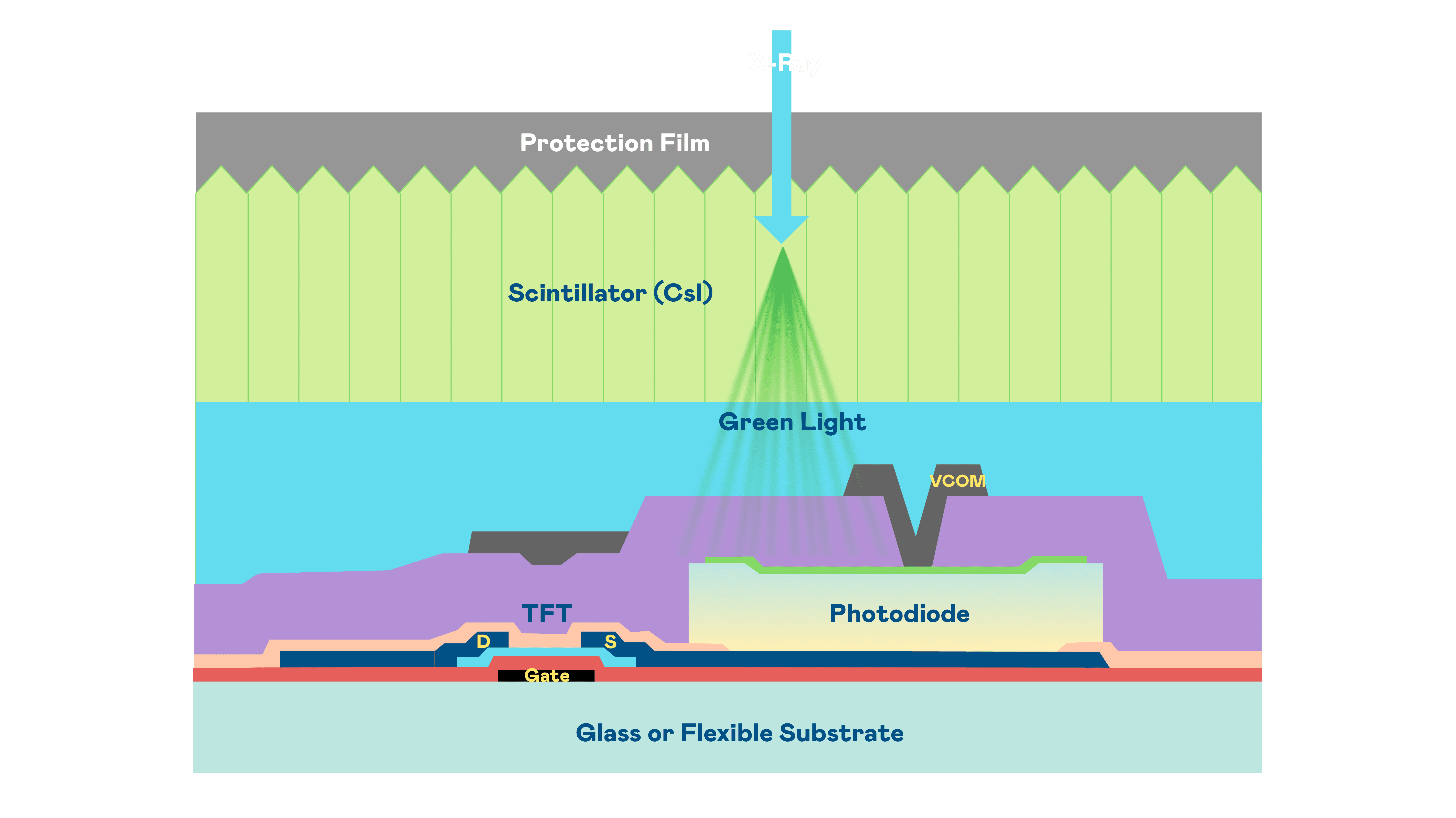 财神娱乐的X光影像感测阵列使用薄膜电晶体 (TFT) 作为每个像素的读取开关,,,,搭配光电二极体(Photodiode)的光电转换元件,,,,用以感测X光影像讯号。。